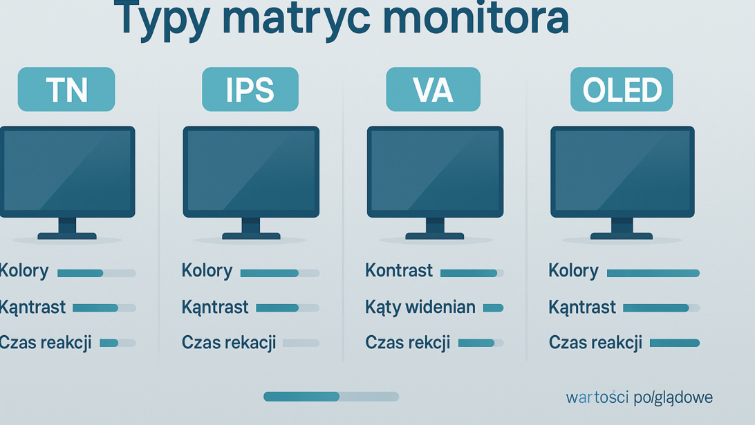 Podsumowując, typy matryc monitora to różne priorytety: TN = szybkość i cena, IPS = kolor i kąty, VA = bardzo wysoki kontrast, a OLED = perfekcyjna czerń i reakcja. Dlatego wybieraj panel pod konkretne zadania, a nie tylko pod „Hz”.