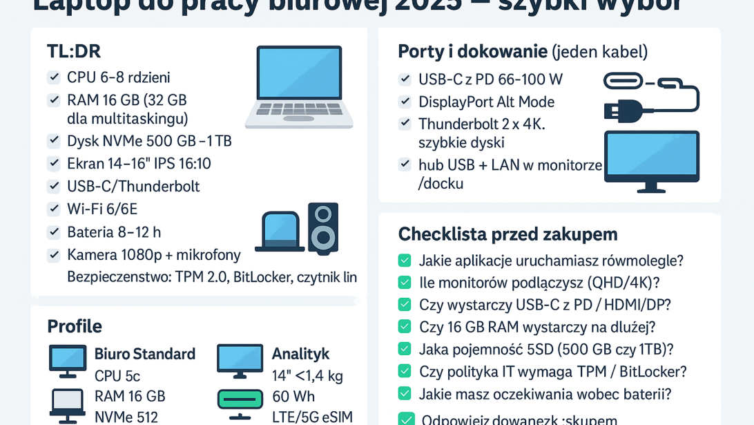 Jeżeli zastanawiasz się, jaki laptop do pracy biurowej 2025 kupić, zacznij od zadań: arkusze, CRM, wideokonferencje oraz praca na 1–2 monitorach. Dopiero potem spójrz na procesor, RAM i porty. Dzięki takiej kolejności łatwiej dopasujesz sprzęt do realnych potrzeb, a przy okazji nie przepłacisz.